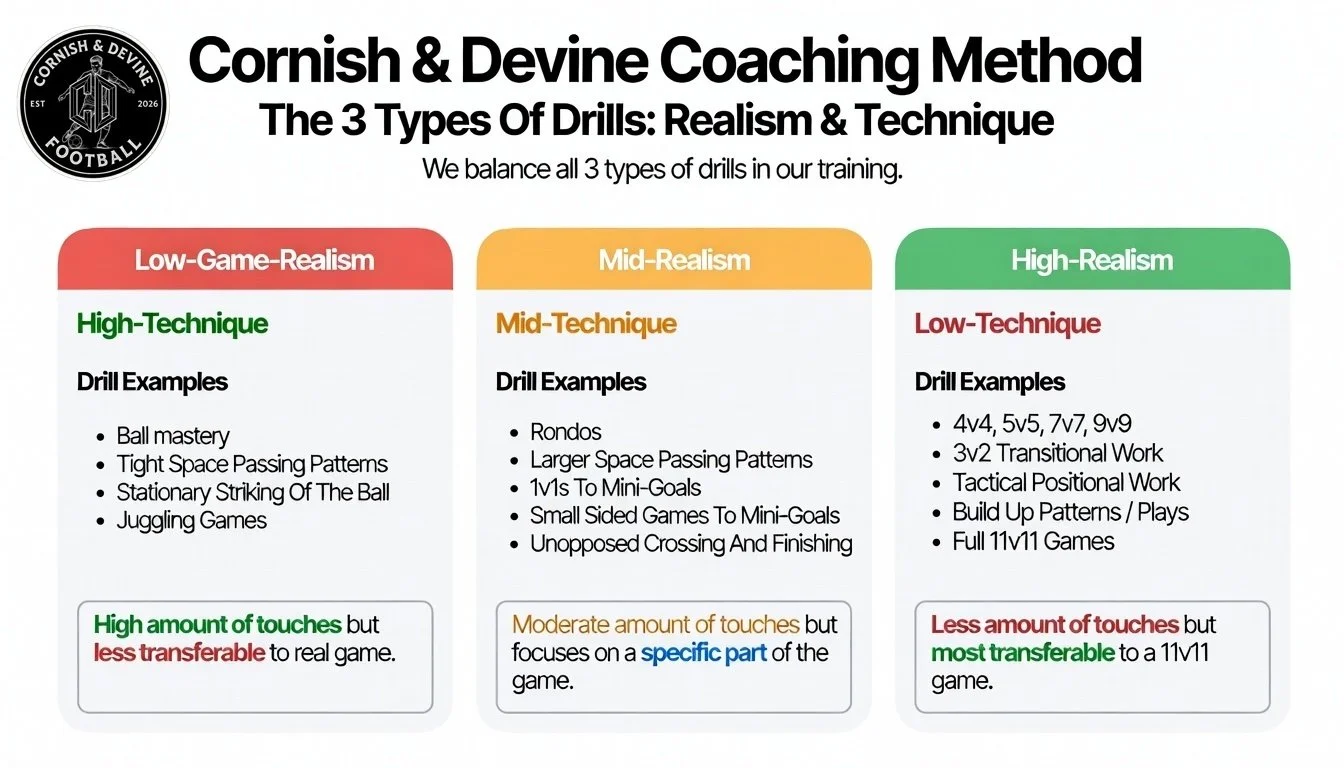 Mid-realism drills (e.g. rondos, 1v1s, small-sided games),